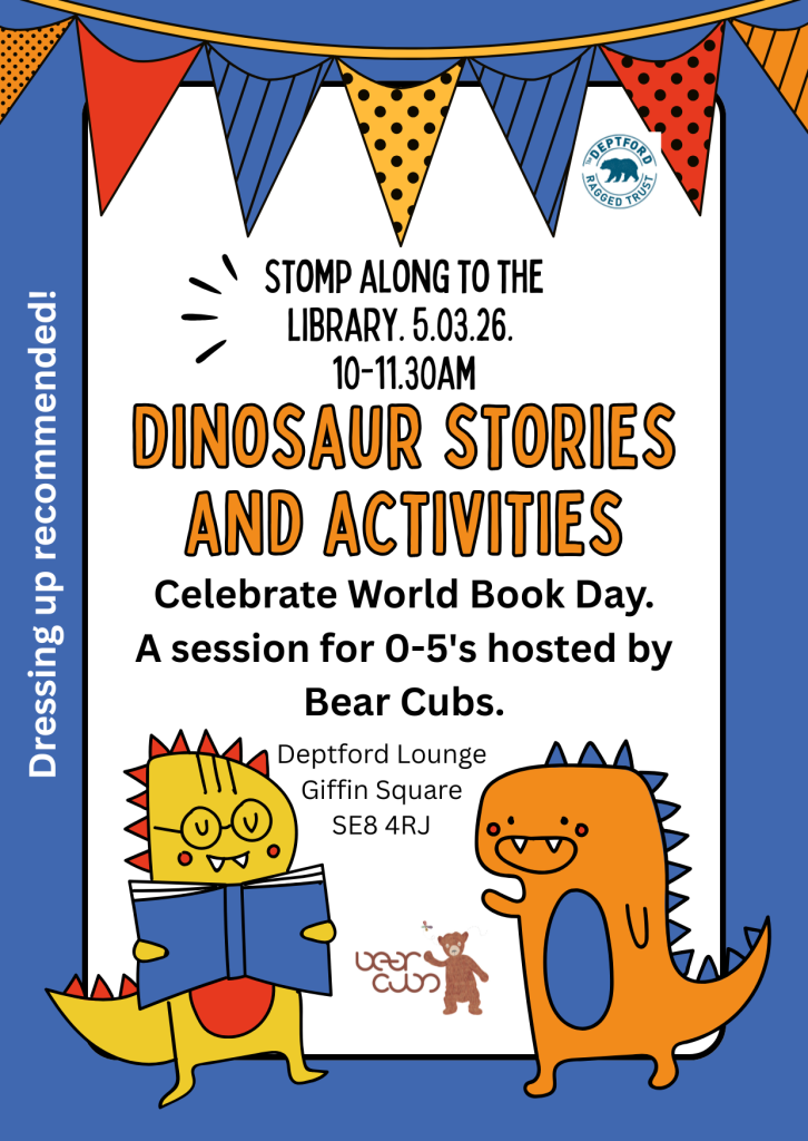 A Dinosaur themed story and song time to celebrate World Book Day, with additional dinosaur craft activities. For 0–5-year-olds and their caregivers. Dinosaur dressing up strongly encouraged! This activity is facilitated at the library by Bear Cubs nursery.