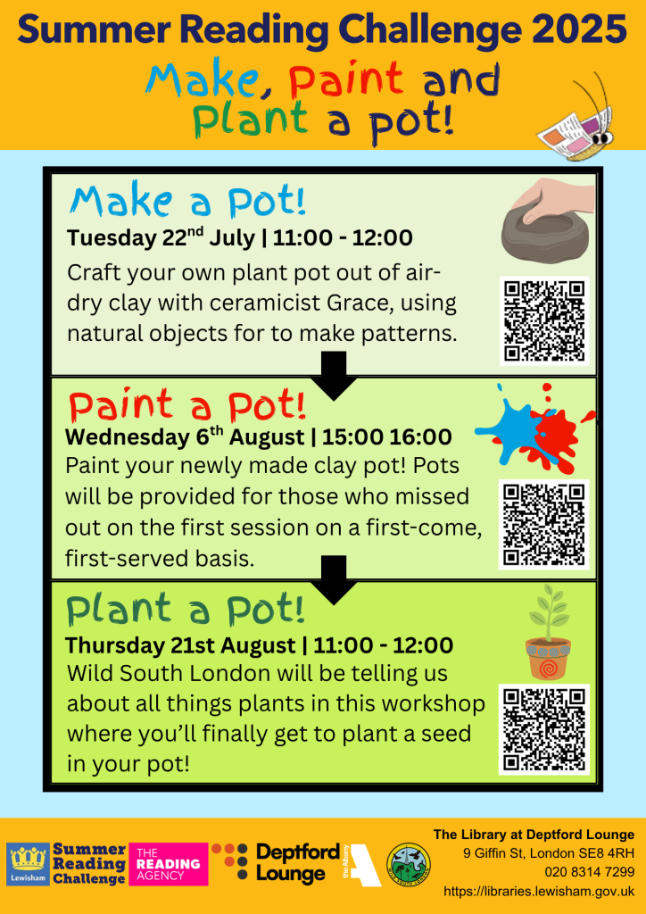 Join us for a series of three workshops where we will make a pot, paint a pot, then finally plant a pot! By the end of the summer, you will have your very own plant in a hand-made plant pot to take home with you!